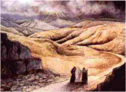 ★エルサレムから11キロ離れたエマオに向かう二人の弟子に、イエス様が近づいて話しかけられます。二人はその御方がまさか復活されたイエス様とは気付かず、エルサレムで起きたイエス様の十字架の死と、お墓からお体が無くなってしまったことを話します。イエス様は、絶望と悲しみで意気消沈している二人に、聖書からその真の意味を解き明かされます。それでもなおその御方がイエス様であることに気付きません。ただ不思議なことに心(霊)が燃える体験をします。