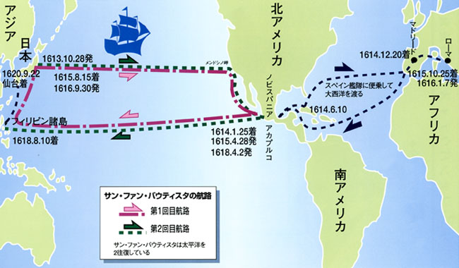 今年と来年にかけて日本とスペインは、2010年9月の日本スペイン首脳会談における合意を踏まえ、「日本スペイン交流400周年事業」を行なうことになっています。それは今年が慶長遣欧使節団派遣からちょうど400周年に当たるからです。400年前の1613年は伊達政宗の時代です。その年の10月28日、仙台藩内で造った木帆船の「サン・フアン・バウティスタ号」(洗礼者聖ヨハネという意味)が、宮城県牡鹿郡月ノ浦を出帆しました。それは伊達政宗の命による慶長遣欧使節団でした。団長は支倉常長(はせくら つねなが)。案内役はフランシスコ会宣教師ルイス・ソテロでした。総勢180名の大人数でした。目指すは、スペイン領のメキシコを経由してスペインとローマです。